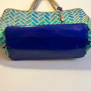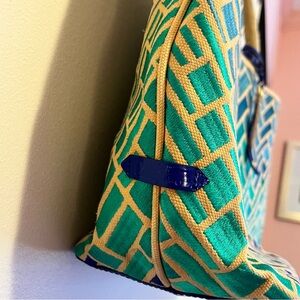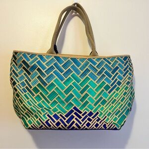 Embroidered rectangles in shades of blue and green form a woven design on canvas. Handles are canvas. Bottom is patent leather which does have some light marks on it.
