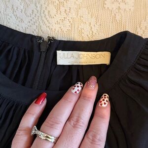 This dress is stunning! So chic and elegant. Puff sleeve with a statement handkerchief hem. Zip up back. A go to black dress! Has beautiful movement while wearing! The only flaw is on the inside lining there are a few spots-only one that can barely be seen from the outside-you can see in the photos. IMO it wouldn’t be noticeable unless really looking. This has been treated and dry cleaned to try and remove. Original dress retailed at $675!