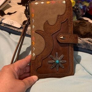 Stylish wallet with intricate design. Features a wrist strap. Embellished with colorful accents and a unique star detail. I bought this at Bucee's!
