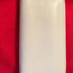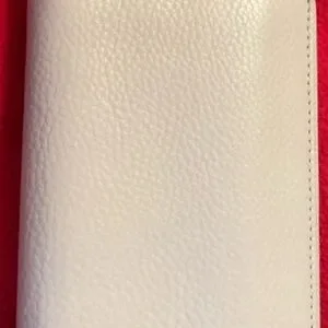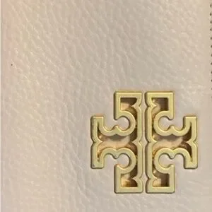 Chic Tory Burch accessory in cream leather. Adorned with iconic gold emblem.