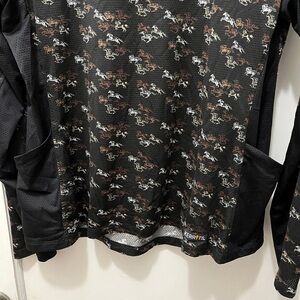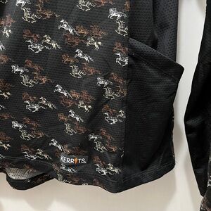 Elegant quarter-zip by Kerrits. Features a black and gray horse pattern. Ideal for equestrian enthusiasts.