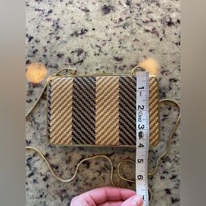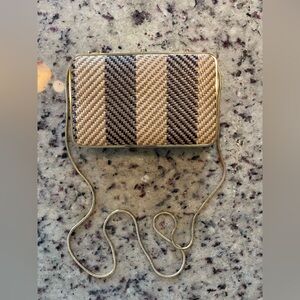 This stylish crossbody bag features a unique woven pattern in shades of brown and tan. Perfect for adding a touch of elegance to any outfit. Excellent like new condition please see pictures for measurements #QuietLuxury #OldMoney #ResortCore #PartyGirl.