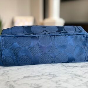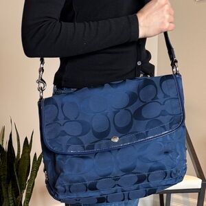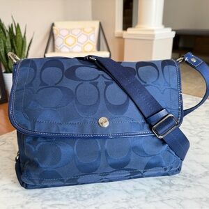 Elegant Coach messenger bag in navy blue. Features signature pattern. Perfect for daily essentials. Adjustable shoulder strap and extra zippered compartment at the back. Main compartment measures 9.5” high, 12.5” wide and about 3” deep.