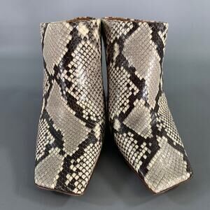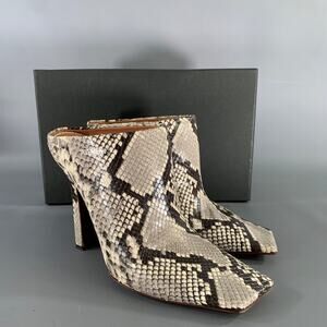 Vetements Snake Boomerang Mules feature an exotic cream, black, and tan snakeskin exterior with a square toes. Made in Italy.