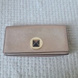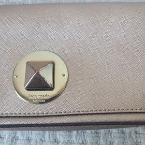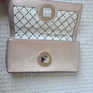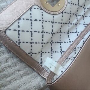 KATE SPADE NEW YORK Rose Gold Clutch Turnlock Leather Bag. Preowned. Minor wear on hardware. Interior card slot. Flap closure. Measurements Included In Pictures.