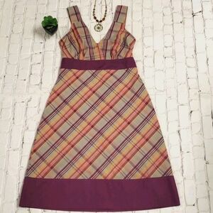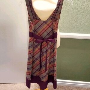 PATAGONIA PLAID SLEEVELESS SUN DRESS (Excellent Condition) - This comfortable and lightweight A-line dress, has a front V-neckline, and an empire waist with a (sewn-in) sash/belt which ties to the back. Made of 65% polyester and 35% organic cotton, the dress has a crinkle texture to the material, and no stretch.