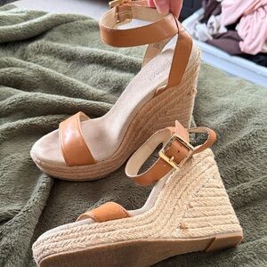 Chic brown wedges with braided platform. Features adjustable ankle strap.