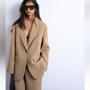 This blazer is crafted from a plain-woven fabric. Designed with a contemporary slouchy, oversized cut, it features notch lapels, pocket details, button cuffs, and a two-button front closure.