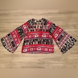 Show Me Your Mumu Boho Tribal Print Relaxed Sheer Tunic Top Bell Sleeves Black Red Size S - in excellent used condition. When laid flat, top measures approximately 20 inches from pit to pit and 25 inches long.
