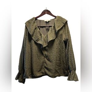 LOFT Olive Textured Blouse Gold Thread Metallic Ruffle Collar Romantic Boho M