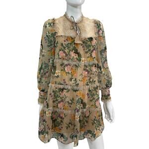Sheer floral chiffon mini dress with a lace yoke and tassel tie, tiered silhouette, and long sleeves with smocked cuffs. Presented in the Romance Almond colorway.