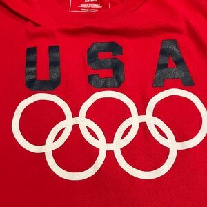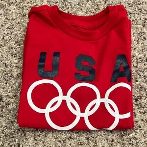 Bright red tee with USA and Olympic rings. Perfect for young sports fans.