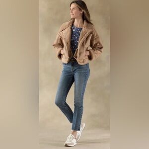 “Moss Ridge Moto Coat” in vegan faux leather with asymmetrical snap front, double faced faux leather and double welt pockets. Roll back cuffs. Approximately 23.5” long. New with tags from Sundance.