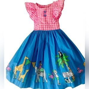 Charming ER Zoo dress featuring a pink checkered top and a vibrant blue skirt with whimsical animals. Perfect for playful days and special occasions. Size 7-8.