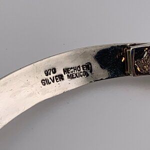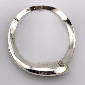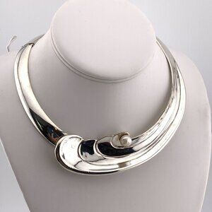 Simply stunning wing style choker necklace collar with a solitaire freshwater pearl made by the master Taxco silversmith artist Antonio Pineda. This is a very rare design that you will only rarely see come available. It is fully marked with Mr Pineda's eagle 17, crown mark and 970 (97% silver). It's mark places it made between 1948 to 1978, most likely made in the mid to late 1950's. Antonio Pineda pioneered the use of hinges and rivets in such a way to be sure his beautiful jewelry would lay elegantly upon the woman wearing it. This piece incorporates three hinges and one rivet so that it gracefully drapes the neck and collarbone, both enhancing the beauty of the jewelry as well as the wearer.