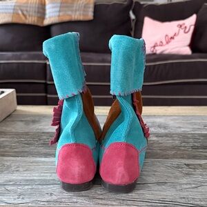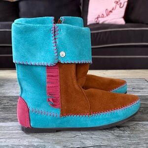 New never worn Minnetonka Stranger Things Holly Wheeler Boot in Pink Turquoise and Brown. Suede boots with fringe. Size 7