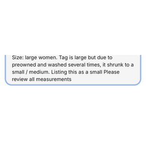 Size: large women. Tag is large but due to preowned and washed several times, it shrunk to a small / medium. Listing this as a small Please review all measurements