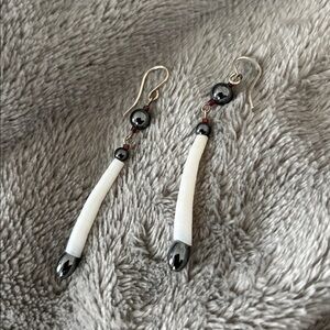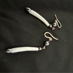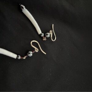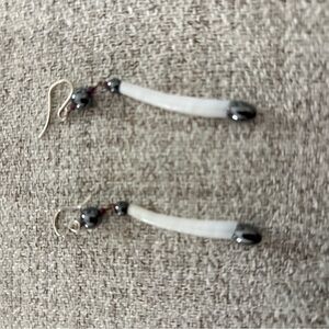 These elegant dangle earrings feature a sleek silver, pewter and white shell design, perfect for adding a touch of sophistication to any outfit.
