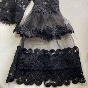 Chic black lace blouse with intricate patterns. Features elegant long sleeves. Perfect for stylish outings.