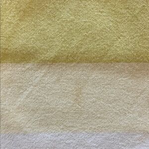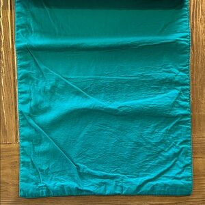 Reversible tablecloth with stripes in teal, white, and yellow. Solid teal color on the other side. No flaws but one stain (see last picture). Not very noticeable.