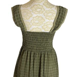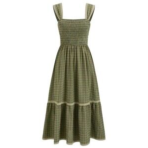 Cider Smocked Midi Dress Fit Flare Tiered Lace Square Neck Plaid Green S