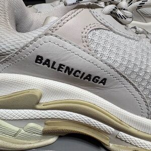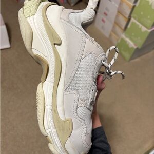 Balenciaga sneakers with a cream and tan design. Modern and chic style.