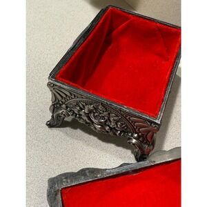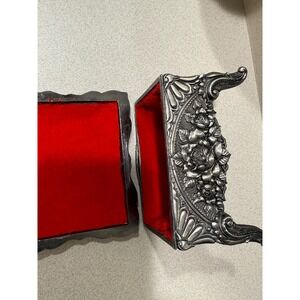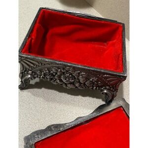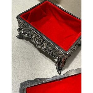 Vintage Silver Tone Footed Jewelry Box Victorian Lady Castle Red Velvet Lining