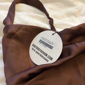 Introducing the Calanthe Maxi Dress in Plum Brown. This satin dress features a square neckline with pleated drape detail and asymmetric pleats on the bodice for a unique look. With tapered straps and a lace up back, this dress is both elegant and playful.
