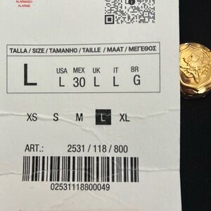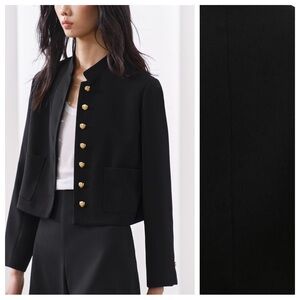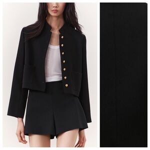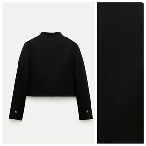 NWT. Zara ZW Collection Black Cropped Jacket with a stand-up collar and long sleeves. Cuffs with buttons and slits. Front patch pockets. Matching lining. Fastens with metal buttons with a raised pattern. Size L. Ref. 2531/118. Pit to pit 20" flat, shoulders 15", sleeves 23", length 19".
