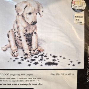 Dimensions cross stitch kit, School featuring an adorable puppy and his paw prints, unopened. This kit, designed by Brett Longley, is 12x10 in for completed picture. The kit contains 14 count white cotton aida cloth, thread palette, cotton thread, needle and instructions. The fabric piece is 16 in by 14 in.