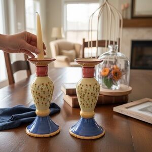 Set of 2 Vintage Pfaltzgraff candle holders from the charming and retired Pistoulet collection. Features pink, blue, yellow, and green hues.