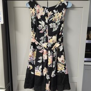 Elegant sleeveless dress featuring a vibrant floral pattern on a black background. Perfect for any occasion.