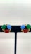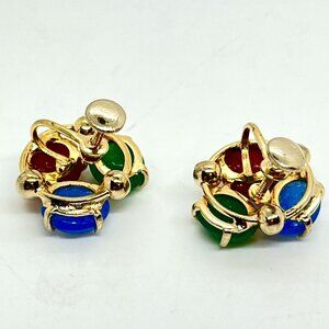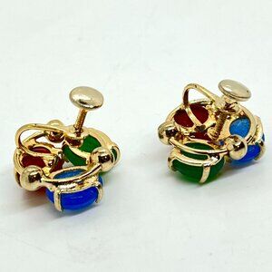 Beautiful VINTAGE GLASS SCARAB EARRINGS Egyptian Revival screwback unsigned beauties. Three richly colored carved glass scarabs in red, green, and blue set in warm gold tone metal. Classic mid century revival style with detailed prong settings and rounded gold bead accents.