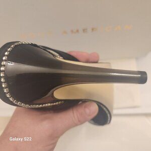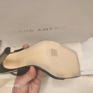 Good American Black Jeweled Heels. NIB. Size 8. NIB (not price tag), original box/packaging. Includes dust bag. Pics are of the 8, but I have a 10.5 in the same condition/box has damage. No rips/tears. Smoke black dye marks on bottoms. Heel height: 4 inches. Clear over the lower foot. Padded on foot. Has some stretch material on backs for fit. All the jewels are intact. Some dust/dirt markings on box. Smoke free home. No odors. All offers are welcome. Thank you! This brand runs small, information online recommends going up 1/2 size.