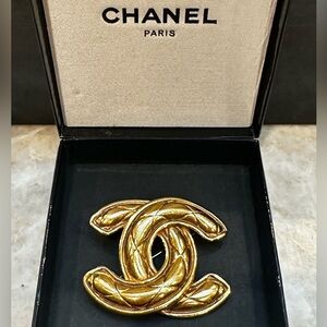 Authentic CHANEL brooch with signature CC logo. Vintage gold-tone finish. Perfect for adding a touch of class to any outfit. I am original purchaser.