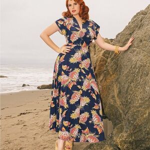 The Seaside Gown is an easy fit, zipper front, 40s dressing gown inspired dress. The front waist ties can cinch as much as you like and the circular sweeping skirt has drama for days! Wear as a dress, evening gown, swim cover- dress her up or down!