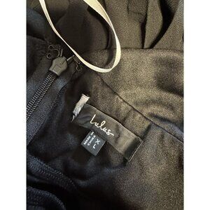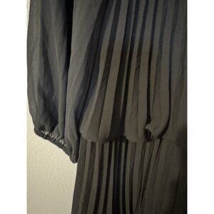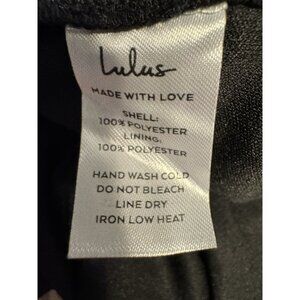 Lulus women's black size extra large gown. Fully lined, made of polyester. Hand washable. Jet black in color. Has tiered rows of fabric down the front. Sheer sleeves and V neckline. Has a beautiful flow.