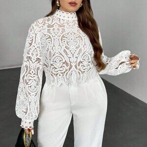 White Elegant Women's Plus Size Lace Hollow Blouse