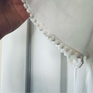 Beautiful lightweight boho-style blouse in a soft white semi-sheer fabric with stunning crochet lace and embroidered floral detailing down the front (lace is see-through). Features a romantic scoop neckline with a delicate tie bow and flutter sleeves with scalloped trim.