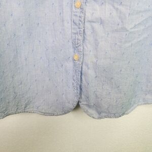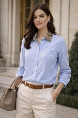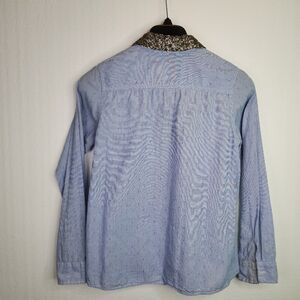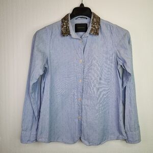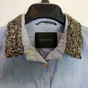 Maison Scotch blouse in women's size 2, fits like a medium. Classic oxford-inspired silhouette with an elevated, heritage-preppy feel. Features a crisp button-front design with a unique sequined collar that adds a polished touch without being flashy. Easy to dress up or down for work, casual wear, or layered preppy styling. Excellent pre-owned condition with no notable flaws beyond minimal wash fading on left sleeve. Model photo is generated for style reference. MEASUREMENTS (laid flat, approximate): Bust (pit to pit): 19" Length (shoulder to hem): 24" Condition notes: Please review photos for overall condition, fabric texture, and details. Any noticeable flaws are shown or described above. Smoke-free home. Ships next business day.