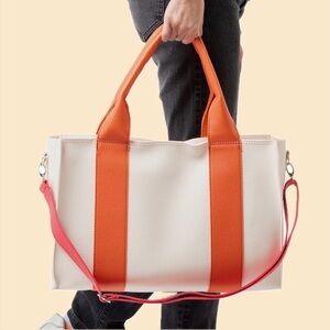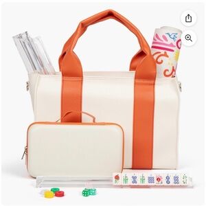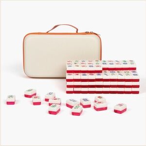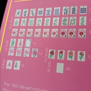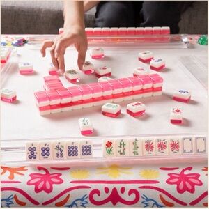 Stylish Mahjong set by Maison Lude. New in packaging. Features pink blue green tiles with floral designs. Backs of the tiles are all pink. Comes with matching premium mat, 4 clear acrylic tile racks with pushers, vegan leather tile case and carrying bag with orange and pink accent straps. The engraved acrylic 160 tiles include all of the jokers, flowers, dragons and winds (NEWS), and the traditional bams cracks and dots. You can play both Hong Kong and American style games with this set. All of the pieces coordinate and feature a feminine, modern twist to this old game. Includes QR code for game instructions, so even if you’ve never played, that’s ok!