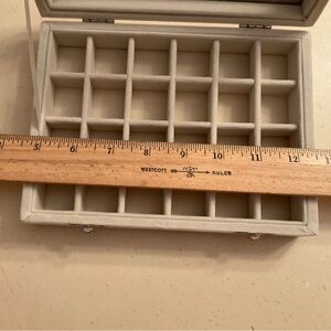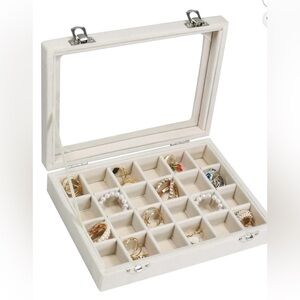 Beige color velvet jewelry box with 24 sections to hold earrings, brooches and rings.