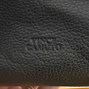 Vince Camuto black leather shoulder bag with gold accents. Perfect for any occasion.