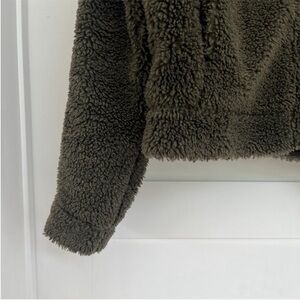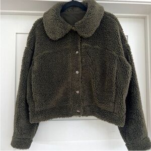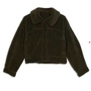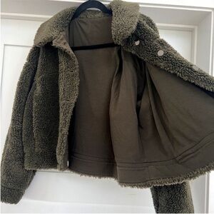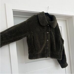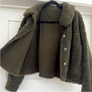 Stay cozy and stylish with this olive sherpa jacket. Perfect for layering, this jacket offers warmth and comfort for any occasion.