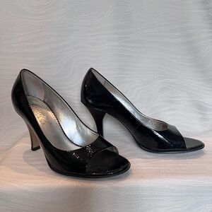 These Franco Sarto black patent heels look timeless at first glance… until the light hits. The glossy finish has a subtle shimmer that gives them just the right hint of glam, paired with a sleek peek toe and a silver metallic insole for an extra touch of polish.
