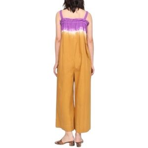 Sea NY Zelda Jumpsuit in Honey. Ruffled neckline, tie-dye ombré in violet and mustard tones, wide-leg silhouette with pockets. Effortlessly bohemian and chic — perfect for warm-weather style.