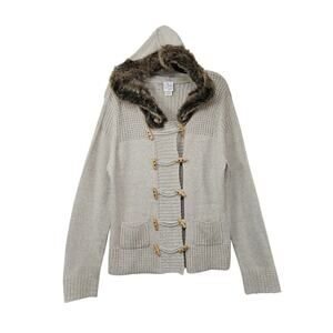 VTG Y2K Women's Knit Cream/Brown Sweater Cardigan Faux Fur Hoodie Toggle Closure Size X-Large, Acrylic/Polyester. Excellent condition! Fashion Bug.