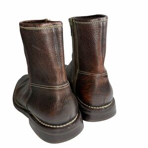 Dark brown pebbled leather ankle boots featuring rich burnished tones and stylish contrast welt stitching. Designed with convenient side YKK zippers, a stacked heel, almond-square toe shape, and durable rubber outsoles for comfort and traction.