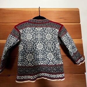 Cozy cardigan with intricate Nordic patterns. Features red, blue, and cream colors.