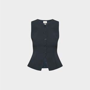Chic dark blue vest and pants set from Aritzia. Sleek design with buttoned vest. Ideal for modern style.